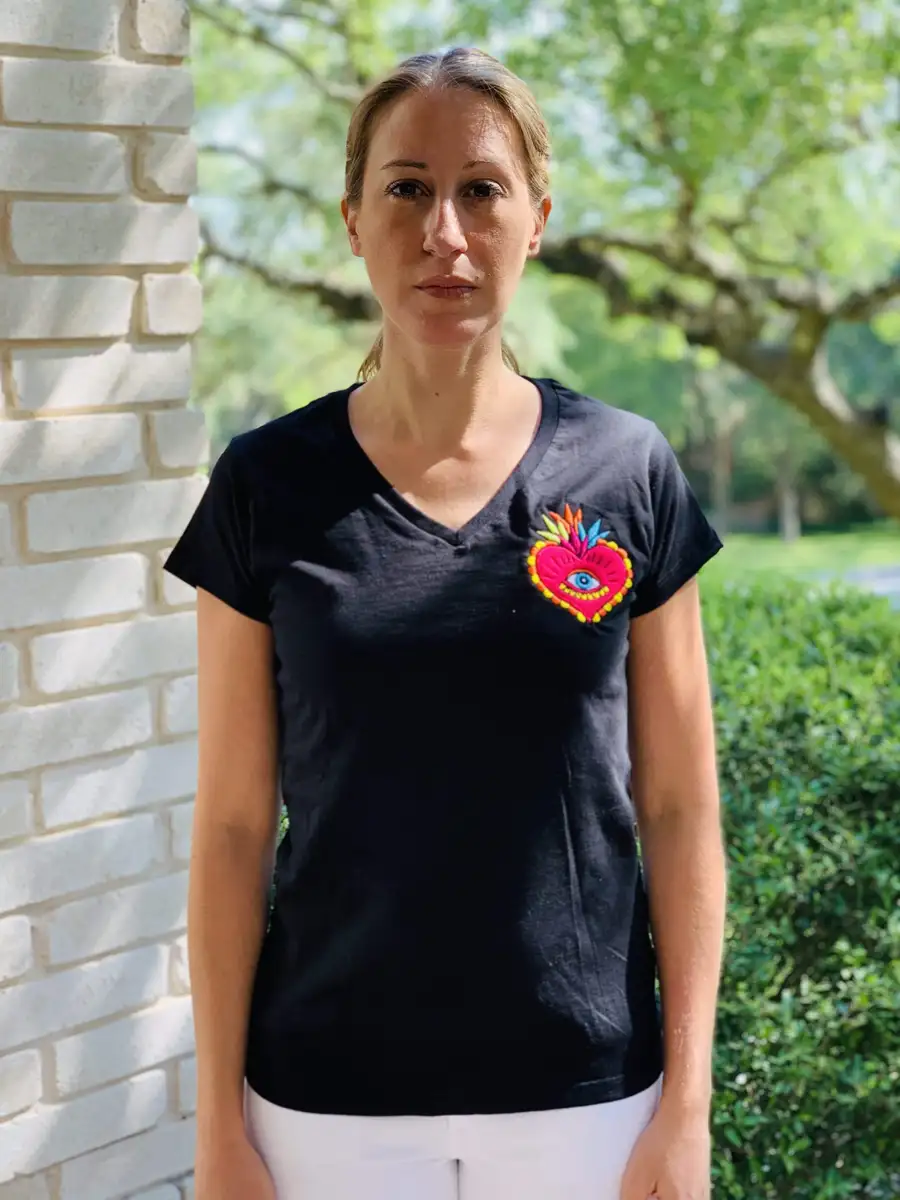 This original design will elevate the essential black T-shirt in your wardrobe game. Black T-shirt for women made of 100% cotton, v-neck, with a beautiful red heart on the chest area.