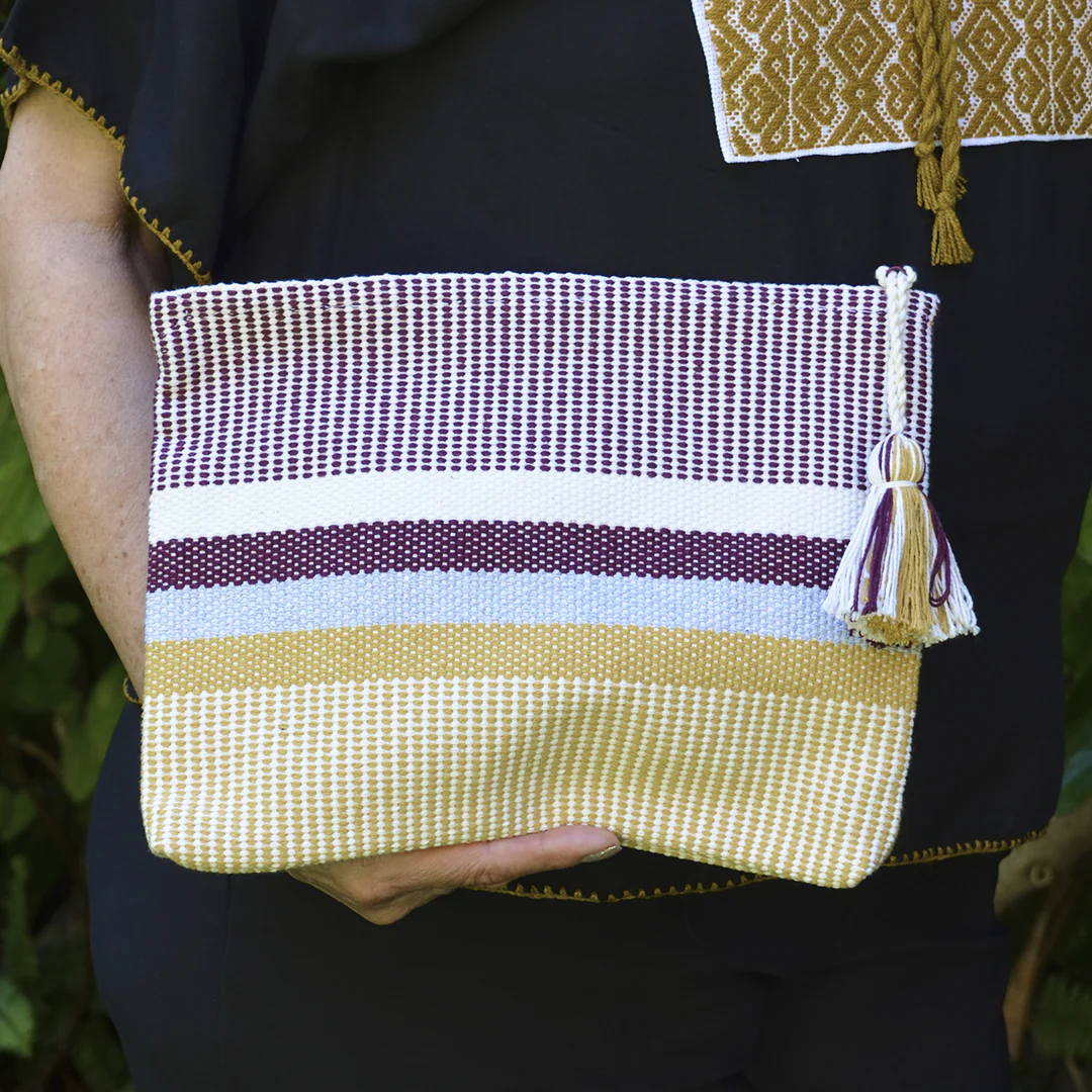 These unique designs are woven by a technique called “telar de cintura,” which consist on weaving threads on a loom with a fixed anchorage at the belt of the weaver. perfect to be worn as laptop sleeves or as cosmetic organizers. Artisanal, resistant, and handwoven in colorful threads.